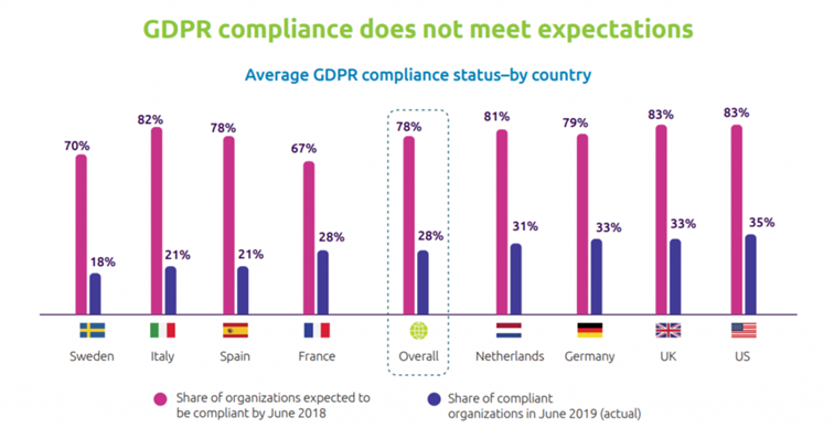 Enligt en rapport från Capgemini Research Institute trodde 70% av de svenska företagen i april 2018 att de skulle vara GDPR-anpassade i juni samma år. Ett år senare visade det sig att endast 18% faktiskt är det. Det här är baserat på självskattning så kanske är det faktiska resultatet ännu sämre.